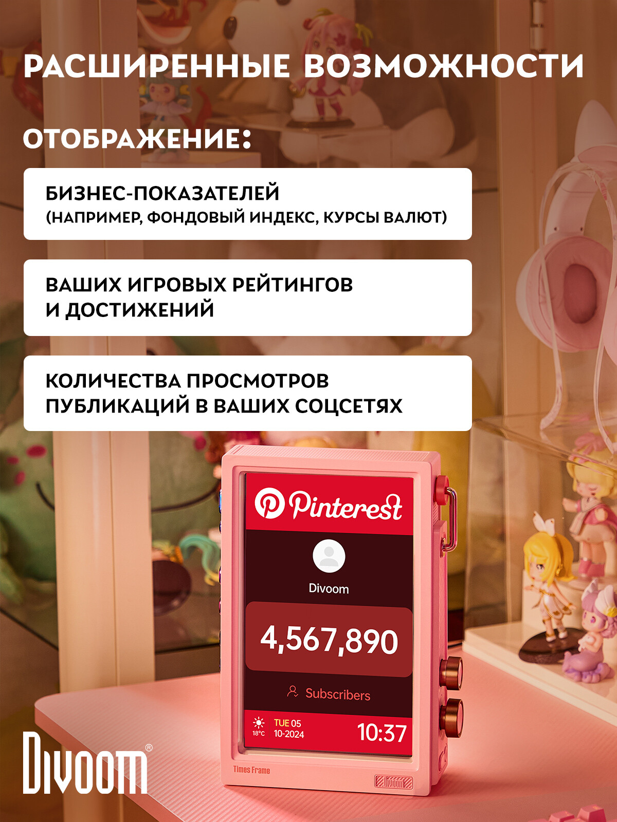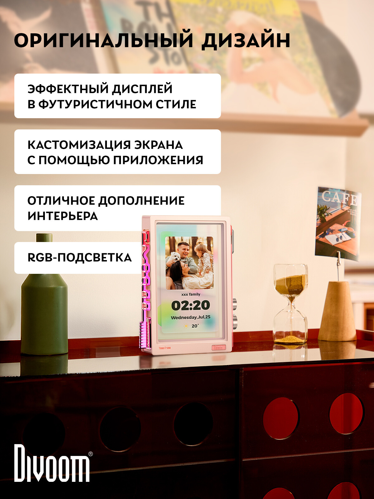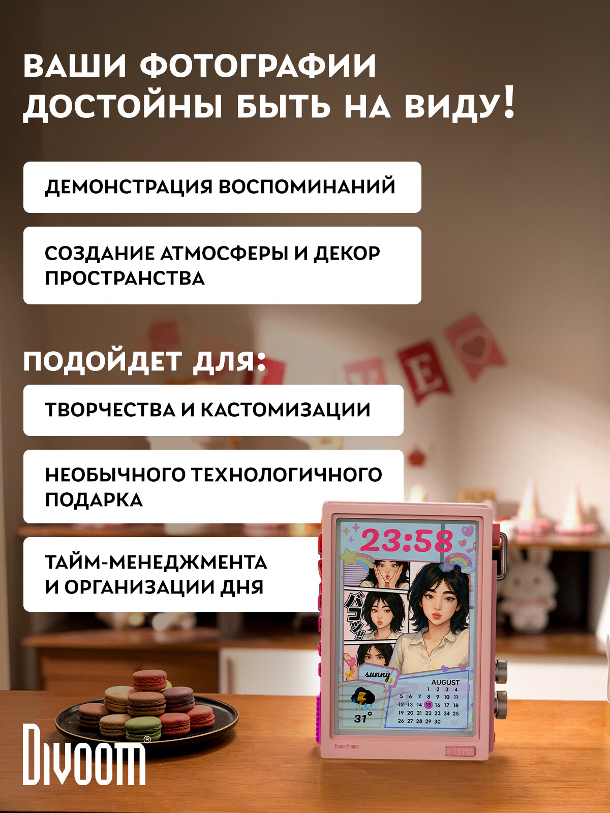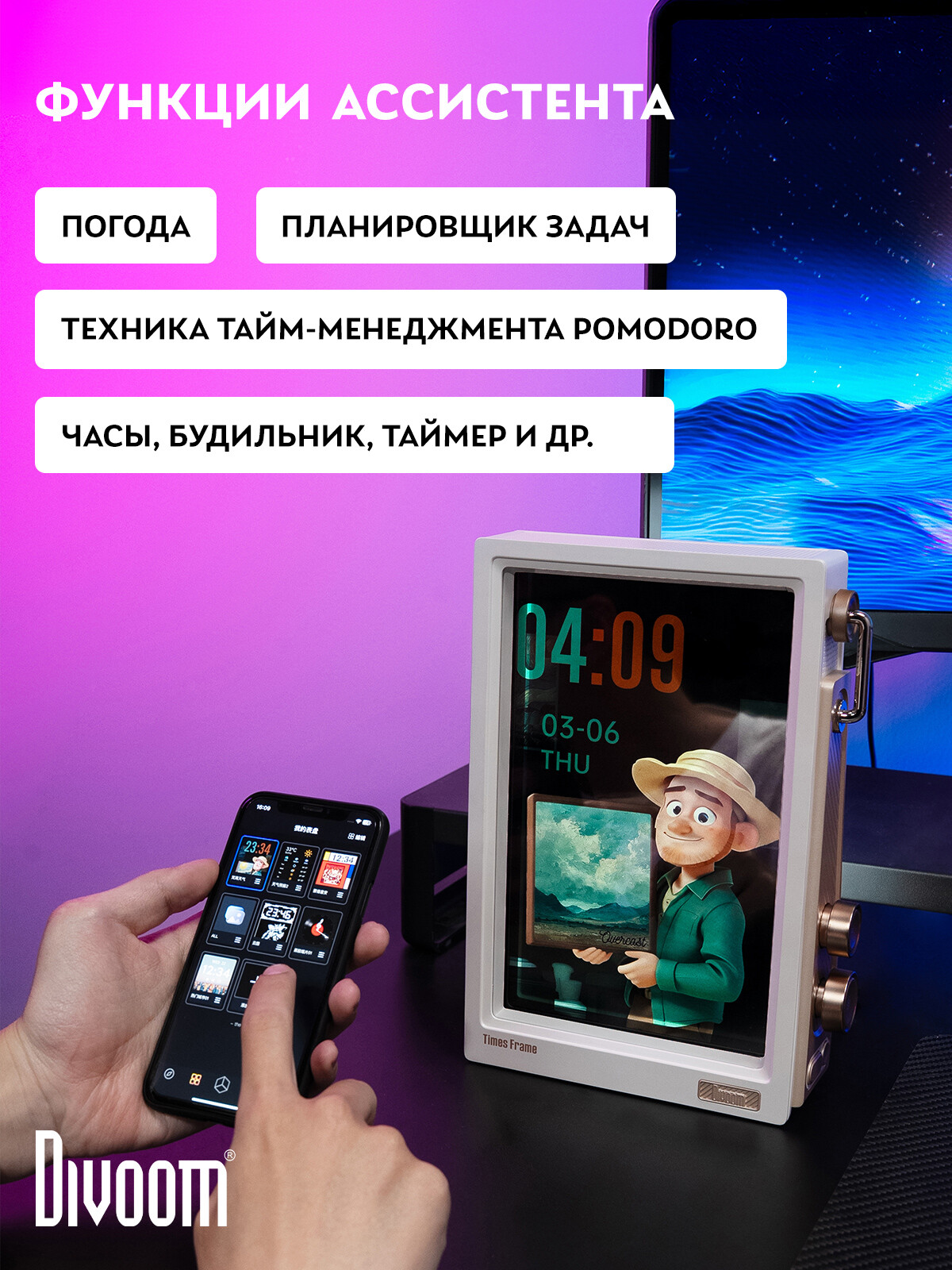 Дисплей Divoom - это стильные многофункциональные девайсы, которые станут ярким элементом интерьера или рабочего пространства. Девайсы предлагают широкий выбор анимаций и изображений, которые можно кастомизировать через удобное приложение. Настолько много возможностей и функций, что дисплеи не наскучат своим пользователям, а их стильный вид прекрасно впишется в любой интерьер и придаст ему уникальности.