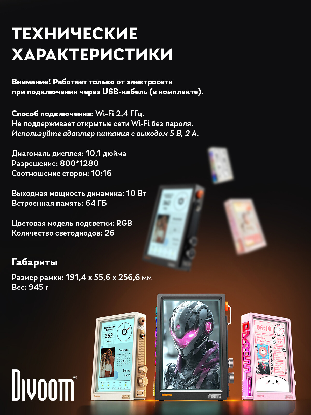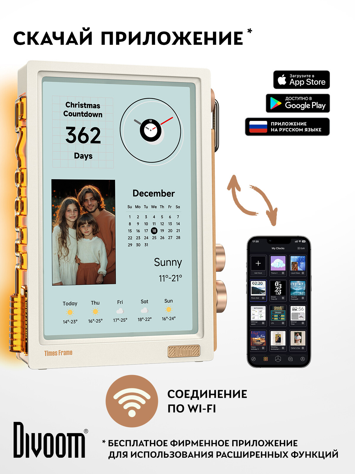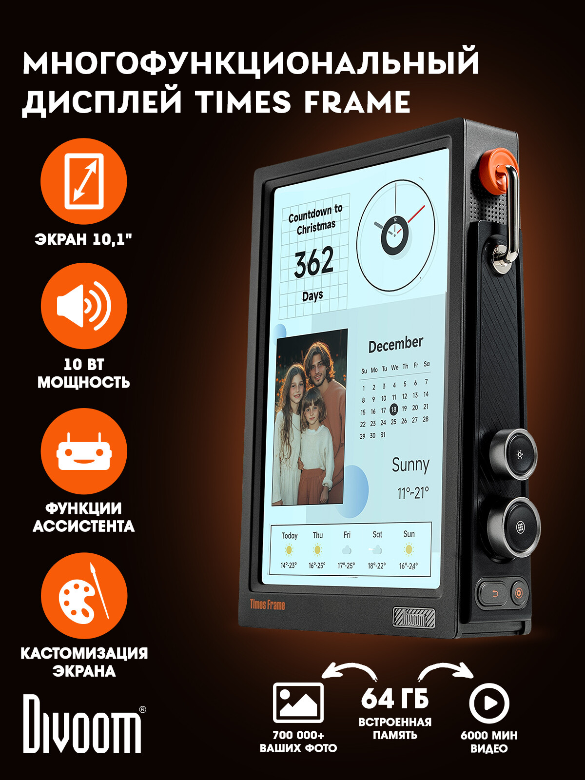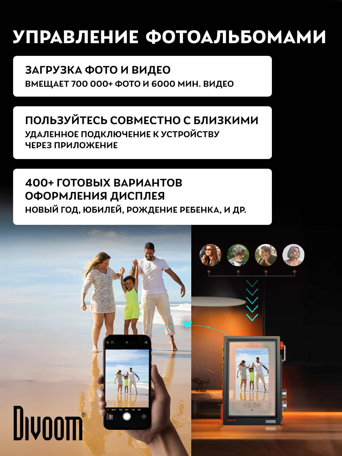 Создавайте настроение одним касанием! Times Frame демонстрирует фото, видео, анимации, текст с поразительной чёткостью и создаёт уникальную атмосферу благодаря 400+ вариантам оформления дисплея.